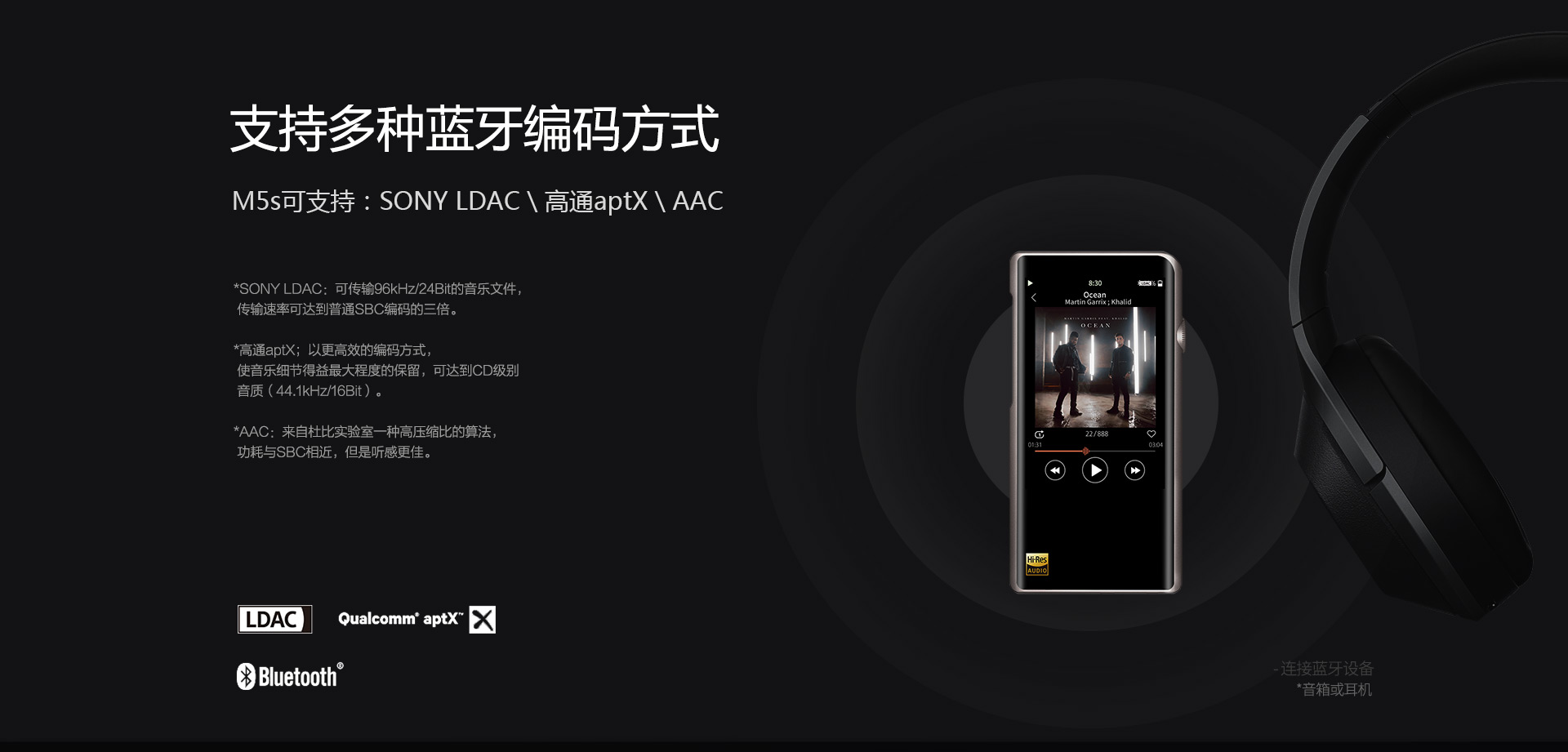支持LDAC(雙向)、aptX(僅發(fā)射)、AAC(雙向)