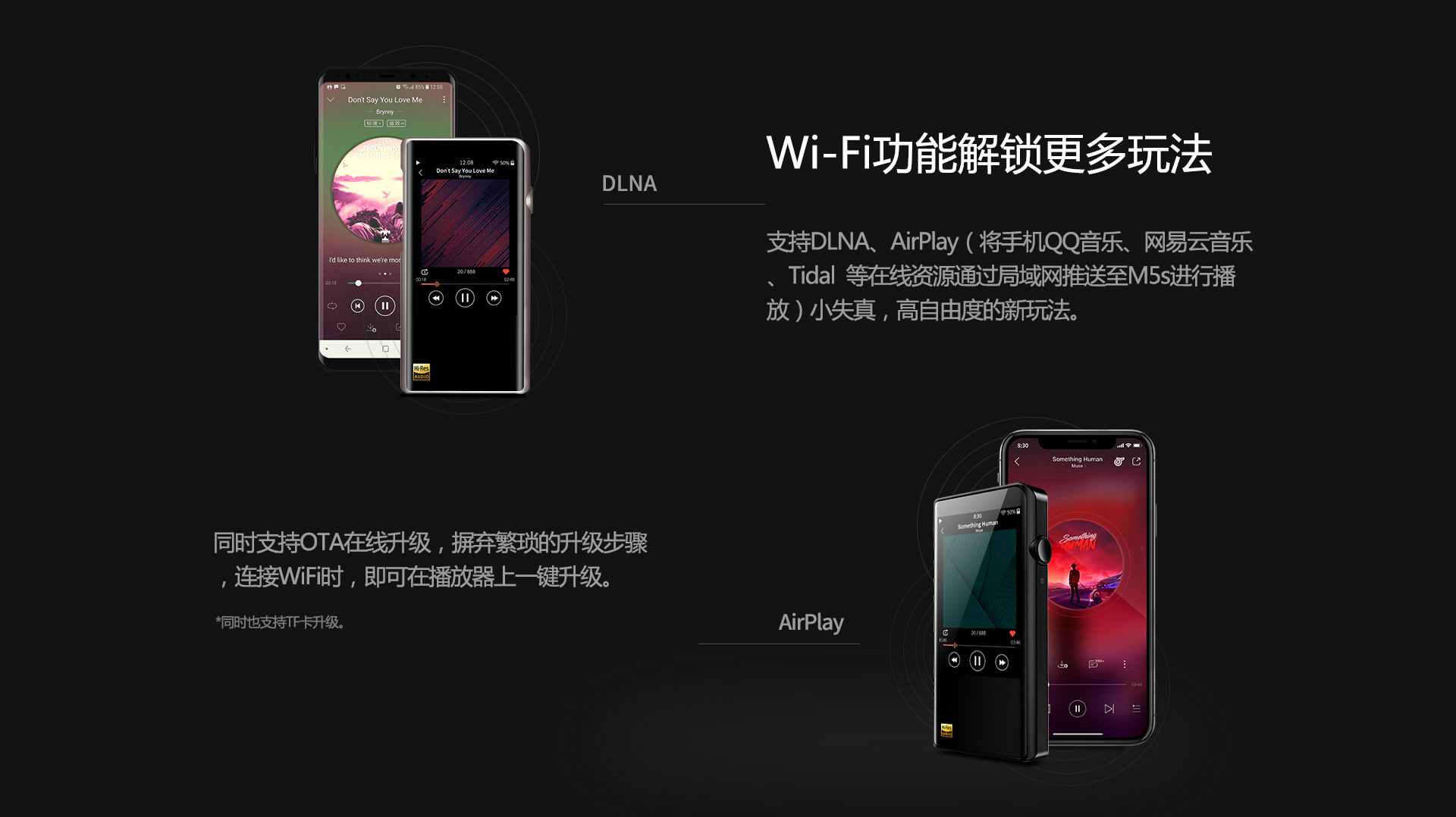 Wi-Fi:IEEE 802.11b/g/n 支持DLNA、AirPlay、OTA在線升級、HiFi云曲庫